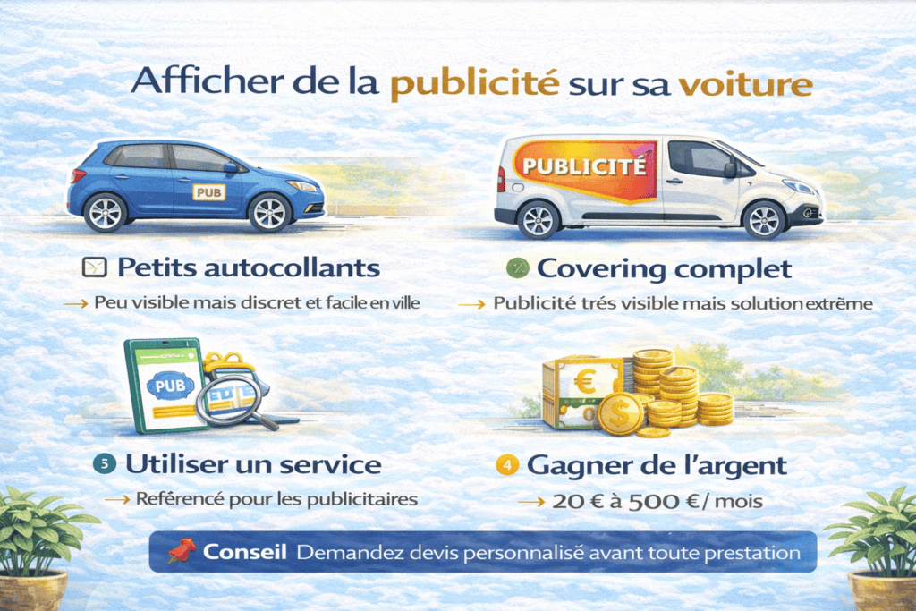 Le fait d’afficher de la publicité sur sa voiture peut rapporter mais comporte des risques qu’il faut maîtriser. Une perspective raisonnable consiste à favoriser des partenaires sérieux et des poses réalisées par un artisan spécialisé. Vous gardez la maîtrise de votre auto et vous transformez un déplacement quotidien en une opportunité contrôlée.